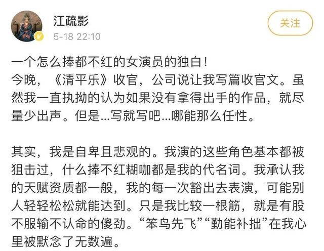 与阔别电视剧许久的李易峰合作了《我在北京等你》和王凯合作了正午阳光的大剧《清平乐》,最后得到的却是铺天盖地“江疏影带不动捧不红”,备受争议。甚至自己也在微博上开始了自嘲的戏码。