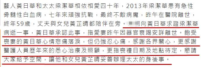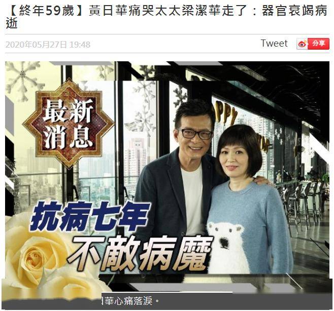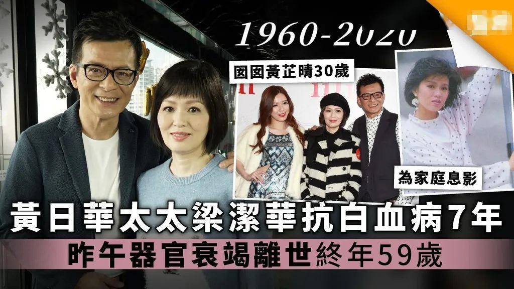 让人惋惜的是,就在本月27日,港媒爆出黄日华的太太梁洁华已于26日病逝,终年59岁的消息。