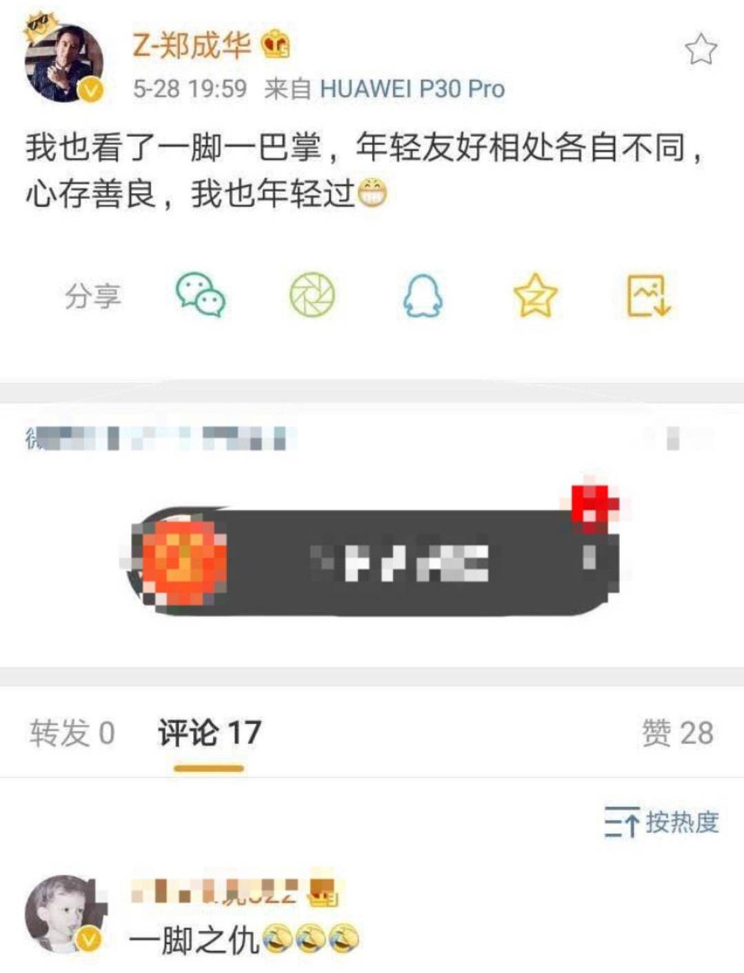 问题在于!许魏洲粉丝也没说啥!郑爽粉丝也没说啥!但是郑爽爸爸出现了!他在微博疑似 回应郑爽打许魏洲:“我也看了一脚一巴掌,年轻友好相处各自不同,心存善良,我也年轻过。”随后郑爸爸删除了这条微博。
