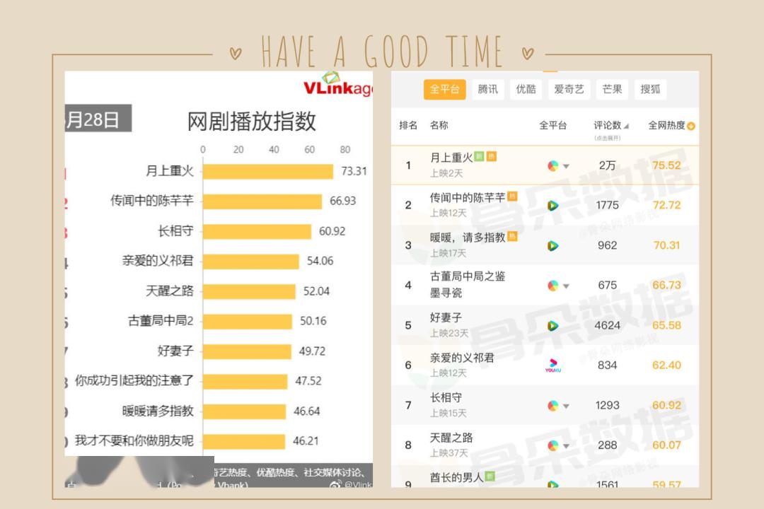 “仗剑江湖只为守护你。”昨晚,粉丝翘首以盼的古言IP剧《月上重火》,正式登陆爱优腾三平台。在原著豆瓣8.0评分、连续5年登陆晋江言情小说人手机电影网气榜首的IP影响力的加持下,《月上重火》的首播热度并不算低: 首播当晚,该剧便拿下三个微博热搜,且在Vlinkage、骨朵等专业数据平台,拿下网剧榜首首位的成绩。