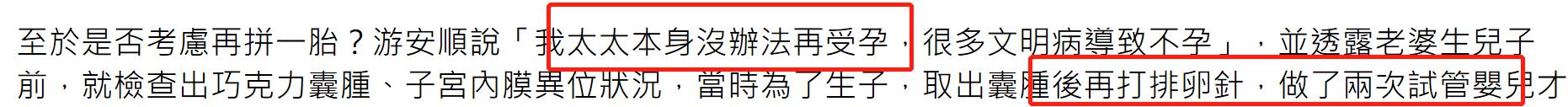 被问到夫妻俩是否准备怀二胎,游恩顺表示太太没办法再受孕,很多病导致不孕症。他还透露了老婆生儿子时的状况。当时老婆被检查出有囊肿,为了生子,她需要取出囊肿再打排卵针,做了两次试管婴儿才成功。