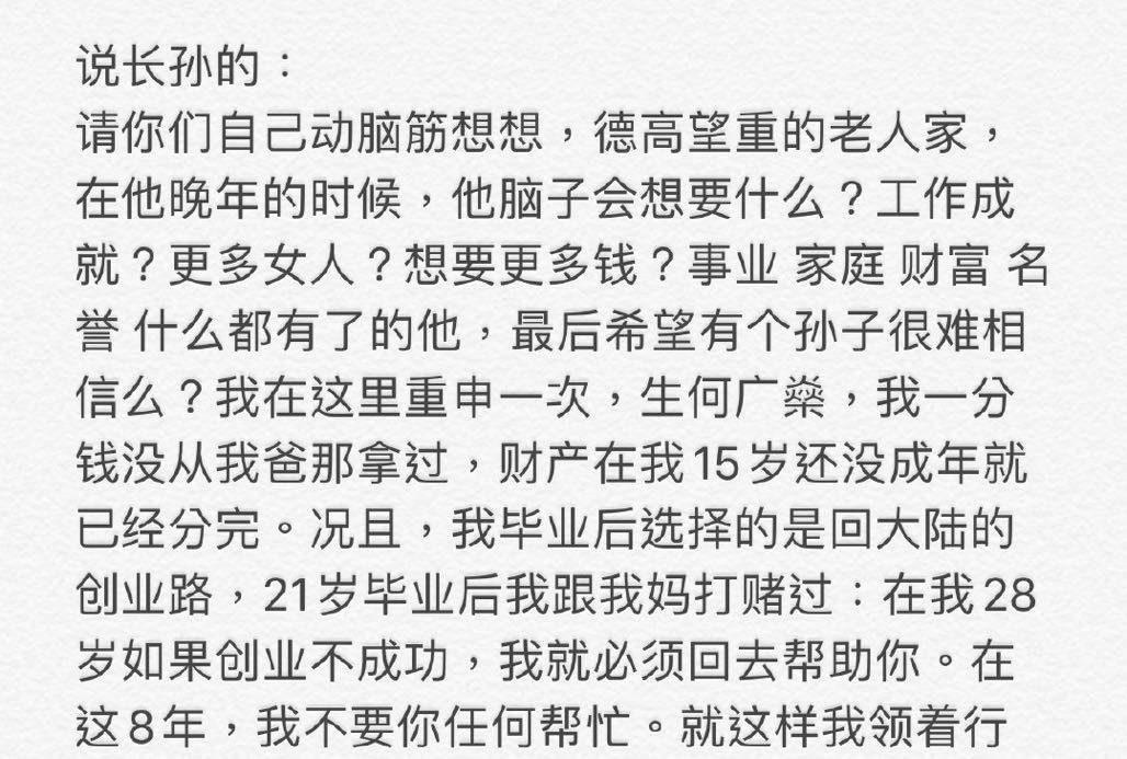 很多人都是道听途说,认为赌王一走必然四房要上演争家产大戏,其实关于家产的分配,何猷君已经回应过,认为早就分了,而现在再度进行回应,认为自己在15岁的时候就已经分了家产,网上资料显示是2011年3月份赌王宣布家产通过各房协议达成共识,后来是赌王起诉二房女儿何超琼和何超凤没有交出股权。如果按照何猷君的说法早在2010年家族财产已经完成分配,后续起诉都是花絮。