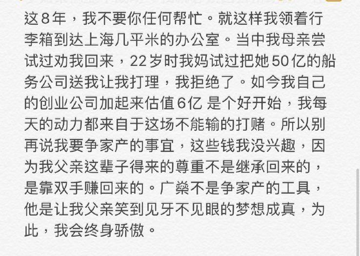 何猷君虽然是在回应微博认证的事,其实他在说明自己完全有能力创造属于自己的财富,当然也曝光了其母亲居然还有市值50亿的船务公司,而且他自己的公司也是估值6个亿,真是将门出虎子,一代比一代强。很多人可能会啃老,但现年才25岁的何猷君无疑给年轻人做出了榜样,赌王的儿子都这么努力,普通人更应该多努力。