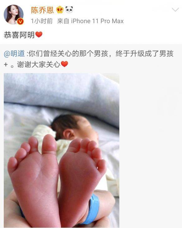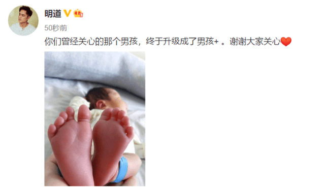 6月10日中午明道在社交平台上晒出了宝宝脚丫照片,并配文“你们曾经关心的那个男孩,终于升级成男孩+,谢谢大家关心”,并配上了一个爱心的表情。正式宣布了自己结婚生子的好消息,看起来小宝宝也十分可爱,作为当年偶像剧的鼻祖人物,网友们对明道结婚有些感慨,纷纷送上祝福。
