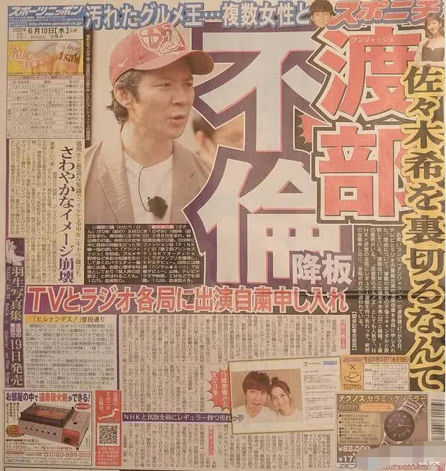网上唾骂渡部建的声音铺天盖地,渡部建估计多半是要戴着“渣男”这顶帽子共度余生了。而渡部建到底有多渣,细说来可能会震碎很多人的三观,据日媒报道,他出轨多名女性,其中包括普通公司职员以及下海女在线电影院星。随后便是各种爆料接踵而来,有日媒爆料,渡部建与佐佐木希开始交往时就已经脚踩多只船,而且结婚生子后也并没有收敛。渡部建不仅参与多人派对,在这些人中更是有固定的对象,而且每次约完还会给对方1万元日币(约人民币660元)的费用。