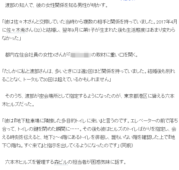 然而没有最渣,只有更渣,据悉渡部建和A女是在多人派对上认识,和B女每次偷吃大概15分钟,然后会给对方1万日币(约人民币660元) 当做酬劳,在找C女时会要求对方找个方便偷吃的会议室,而地点若是在卫生间,则每次大概三五分钟,事后会要求对方删除聊天记录。这一系列操作看下来着实令人叹为观止,每次偷吃时间越来越短,渡部建不累吗?