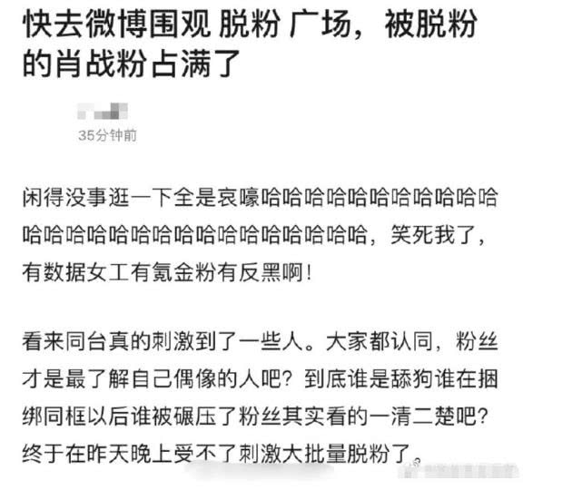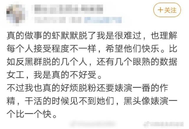 也有其他粉丝表示,这次脱粉的粉丝的确为肖战付出了许多,他的脱粉是一个遗憾。还有很多为肖战做数据的女工,也看不得这个场面,纷纷脱粉,因为一次同台互动就惹出这么多事端,想必明星本人也很难接受。