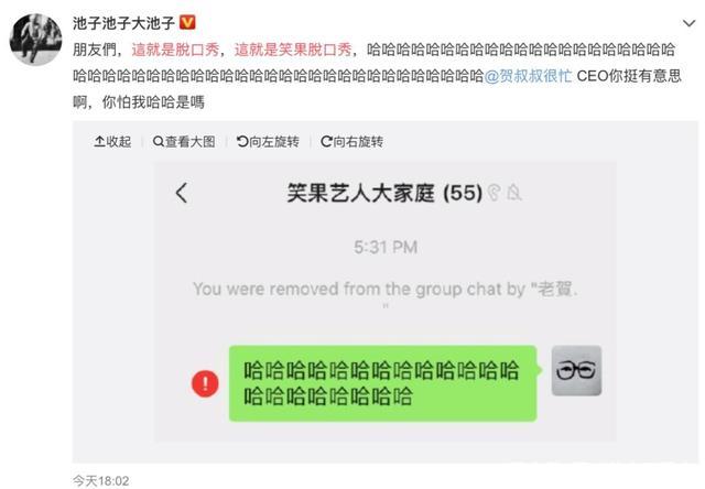 1月9日,池子发布被笑果文化联合创始人、CEO贺晓曦移出群聊的截图,并配文“朋友们,这就是脱口秀,这就是笑果脱口秀……CEO你挺有意思啊,你怕我哈哈是吗”?