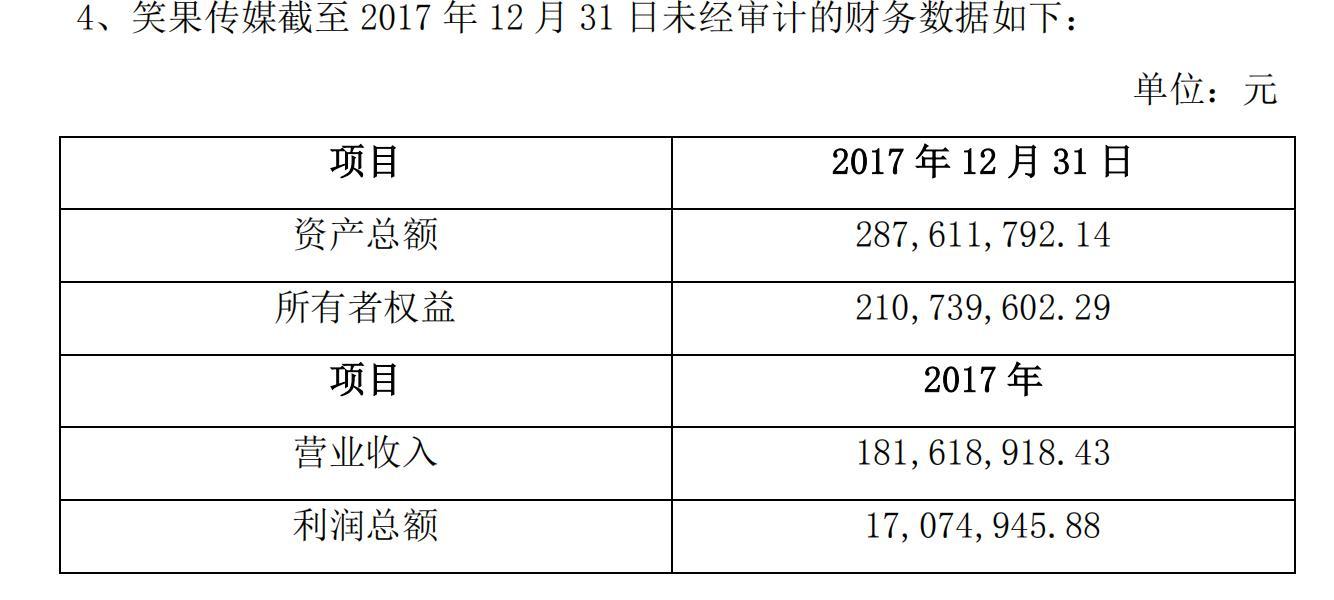 虽然笑果文化并未公布过相关财务数据,不过,每经记者注意到,在游族网络的关联交易,笑果文化的经营状况曾被摆上台面:2017年公司营收达1.81亿元,实现净利1707万元。
