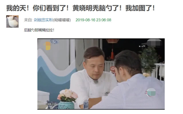 从网友接连不断的议论中,一条评论却是异常扎眼,有网友感叹Baby和黄晓明果然是一家人,表示:“和黄晓明不是一家人不进一家门”。该网友的这句话也戳中了不少人的笑点,因为就在《中餐厅》大火,“明学”热度正高的时候,有网友在节目中发现黄晓明的后脑勺脱发迹象明显。稀稀拉拉的碎头发也让不少网友嘲黄晓明应该是植了发,这只是术后正常的症状。