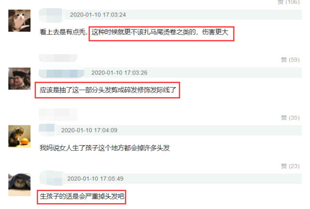 而对于Baby的“秃头”原因,有网友解释可能是Baby抽出了缺口处的头发来修饰发际线了,所以那一块儿看上去有点秃。Baby初现“秃头”症状,让操心的网友对她的发型也十分关切,表示Baby这种时候就更不该扎马尾烫卷之类的,对头发的伤害更大。除了从造型方面找问题,也有理智的网友表示Baby之所以脱发也是因为生孩子对女性的影响比较大,这种情况女明星也难以避免。