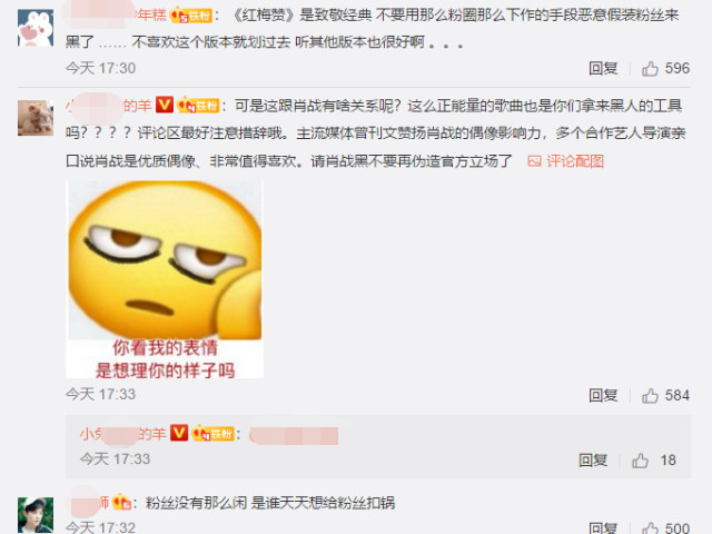 网友们却认为这是有人故意为之,借此抹黑肖战且好让肖战粉丝背锅。网友还强调这跟肖战没有关系,《红梅赞》是致敬经典,这么正能量的歌曲不是拿来黑人的工具。