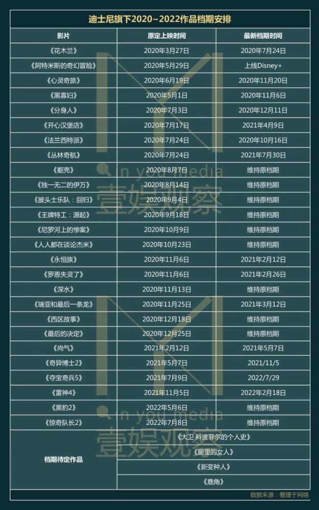 壹娱观察(ID:yiyuguancha)整理了迪士尼旗下近30部作品档期安排表,通过图表可以看出,迪士尼7月份之前的作品全部更改档期。头部作品《花木兰》《黑寡妇》《永恒族》《奇异博士2》《雷神4》都有3~6个月的档期延迟,以规避自身之间档期冲撞。《夺宝奇兵5》更是有一年多的缓冲期。