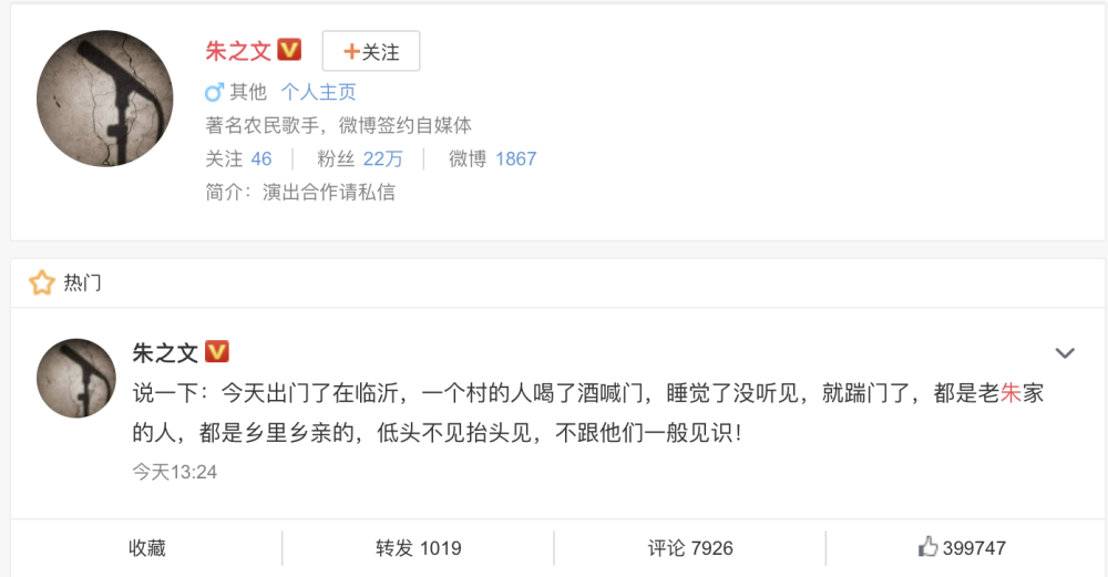 4月18日,名为“朱之文”的微博认证账号发文回应此事表示:说一下:今天出门了在临沂,一个村的人喝了酒喊门,睡觉了没听见,就踹门了,都是老朱家的人,都是乡里乡亲的,低头不见抬头见,不跟他们一般见识!