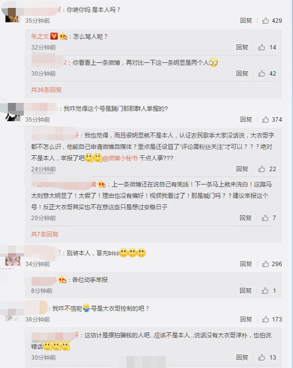 不过,有网友发现大衣哥朱之文回应家门被踹之前称“我可以一再降低底线,但你不能认为我没有底线”,而后来又回应说不跟他们一般见识,这画风的突变令大家认为最后那条微博并不是大衣哥本人发的。