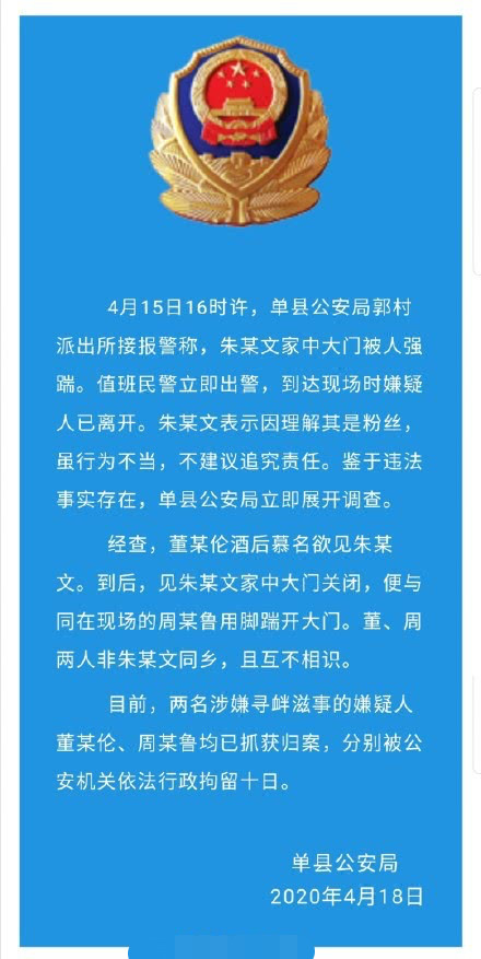 虽然大衣哥不追究相关责任,但是当地公安局已经介入调查并发布通告称:4月15日16时许,单县公安局郭村派出所接报警称,朱某文家中大门被人强踹。值班民警立即出警,到达现场时嫌疑人已离开。朱某文表示因理解其是粉丝,虽行为不当,不建议追究责任。鉴于违法事实存在,单县公安局立即展开调查。