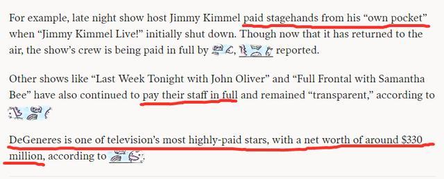 根据内部人士透露的消息,上周有不少《艾伦秀》员工收到了工资要扣掉60%的通知,与这一情况相比,目前只有4位员工远程负责播出工作,也就是说30多位员工中的绝大部分人都面临降薪问题。