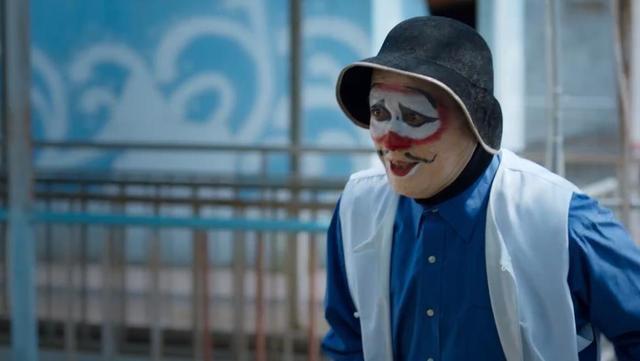 金士杰的出场有些惊悚,脸上涂着小丑的油彩,卸下妆就是满脸的疤痕,整个人都透着诡异。