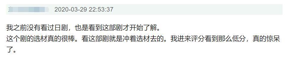 有位观众说:我之前没有看过日剧……看这部剧就是冲着选材去的,我进来评分看到那么低分,真的惊呆了。
