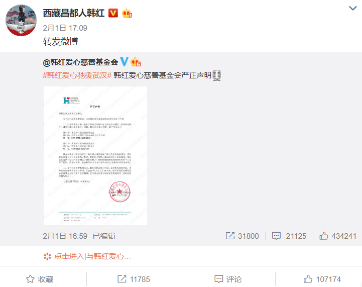 因为某些因素在疫情爆发时刻,韩红成为了大家信任的捐款对象。