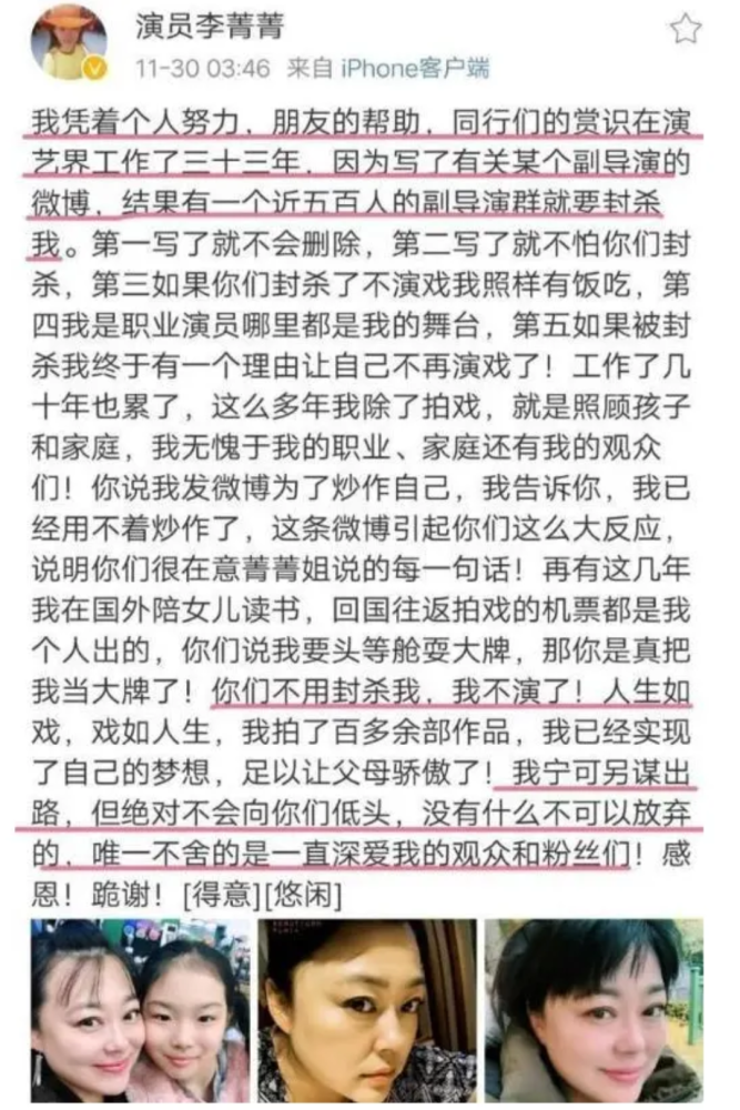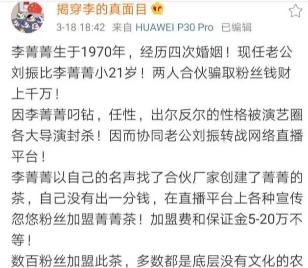 其实还是秉持一点不知全貌不给予评价,但在爆料人发文中称李菁菁经历过四次婚姻,并且在日常生活中性格刁钻,让不少粉丝大跌眼镜。之前李菁菁突然“退圈”李菁菁自己也爆料称自己有被五百多人副导演群联合抵制,当时还有不少网友为其打抱不平,但现在反而让网友产生质疑是不是李菁菁个人原因?