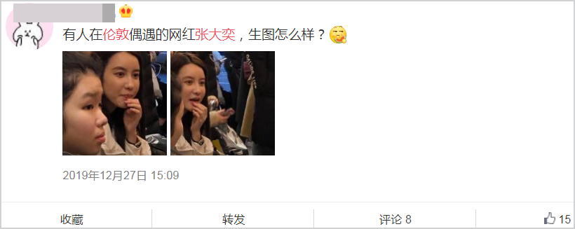 随后,有人扒出了张大奕在去年12月份的行程,在去年12月27日,正好同上述爆料人偶遇的同一天,有人在伦敦偶遇张大奕,还拍摄到了她的生图。