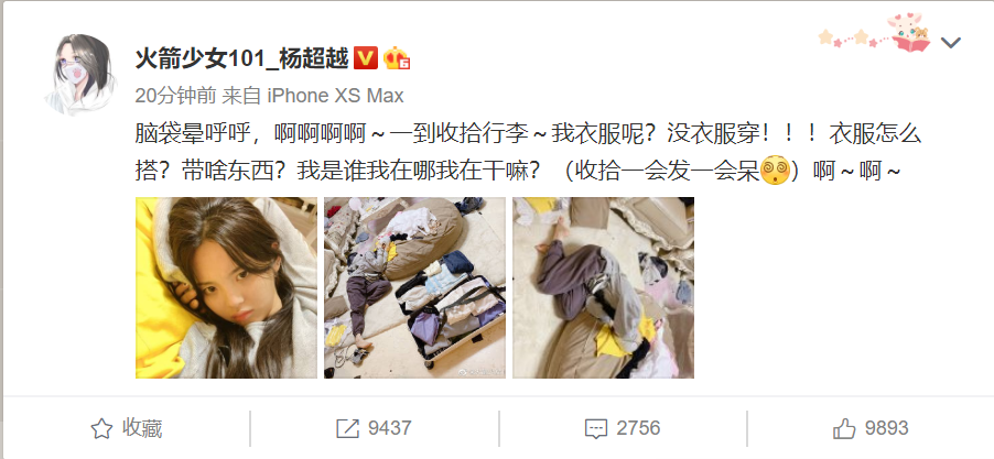 4月19日凌晨,杨超越在社交平台上感慨了一番,一向很刚的杨超越也有无奈的时候。看着这个可爱的小姐姐也是为她感到忧伤啦。杨超越称:“脑袋晕呼呼,啊啊啊啊,一到收拾行李~我衣服呢?没衣服穿!衣服怎么搭?带啥东西?我是谁我在哪我在干嘛?”看出作为女孩子什么都很不容易。