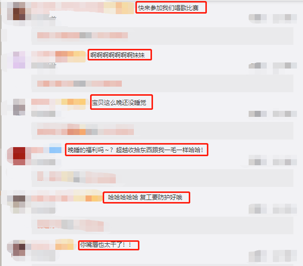 就刚凌晨杨超越感慨自己收拾东西头晕乎乎的消息后,哪怕是半夜,她的粉丝们也是在为她打call。“快来参加我们唱歌比赛”、“宝贝这么晚还没睡觉”、“晚睡的福利吗~?超越收拾东西跟我一毛一样哈哈!”“哈哈哈 复工要防护好哦”、“你嘴唇也太干了!”
