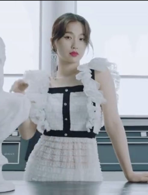 可能是知道自己真的胖了,所以发型并不是可爱的两条辫子,而是直接披下来遮脸,但是并没有效果,因为脸真的太大了,也正是因为脸大,所以显得她的眼睛也小了,真的可以用绿豆眼来形容。再加上那死亡芭比粉的嘴唇,说实话,小8一开始真的没有认出她是谁。