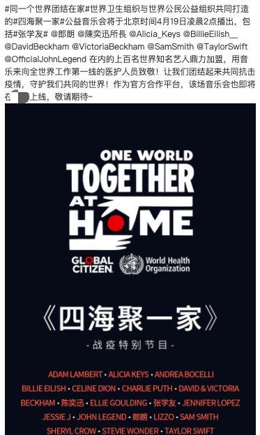 北京时间4月19日凌晨2点,由世界卫生组织与世界公民公益组织共同打造,(Lady Gaga)策划的“四海聚一家”公益线上巨星演唱会,在网络上盛大举行。