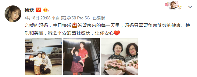 4月18日,杨紫还在社交平台上发文为妈妈庆生,并晒出与妈妈的童年合照,暗含对妈妈多年来一直陪伴的感激,超有爱。