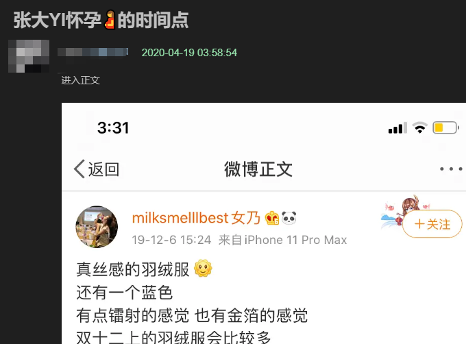 4月19日,有网友声称发现了张大奕的怀孕时间线,表示: