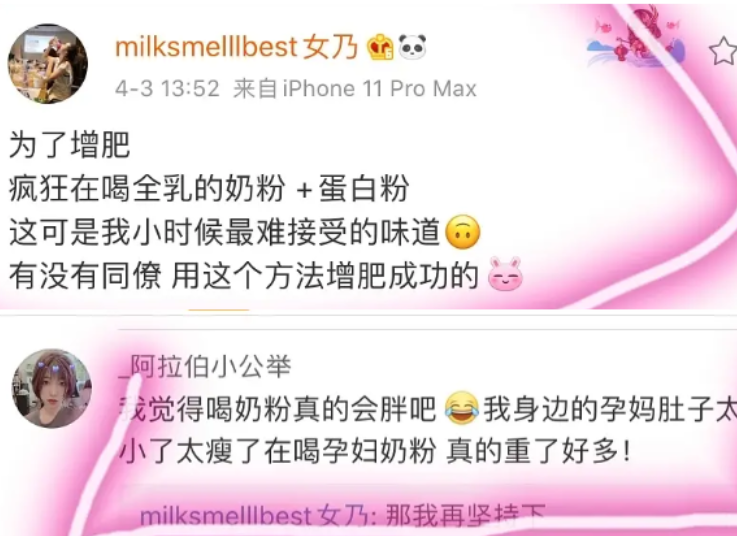 2.张大奕小号在4月初的时候,曾向粉丝求助增肥,奇怪的是,身为网红+主播模特,一般来说都对自己身材要求非常苛刻的,明星们在疫情期间都努力减肥以备工作,张大奕却想要增肥,还是增加营养和能量的高热量奶粉。除此以外,她还在粉丝的建议下喝了能增肥的孕妇奶粉。