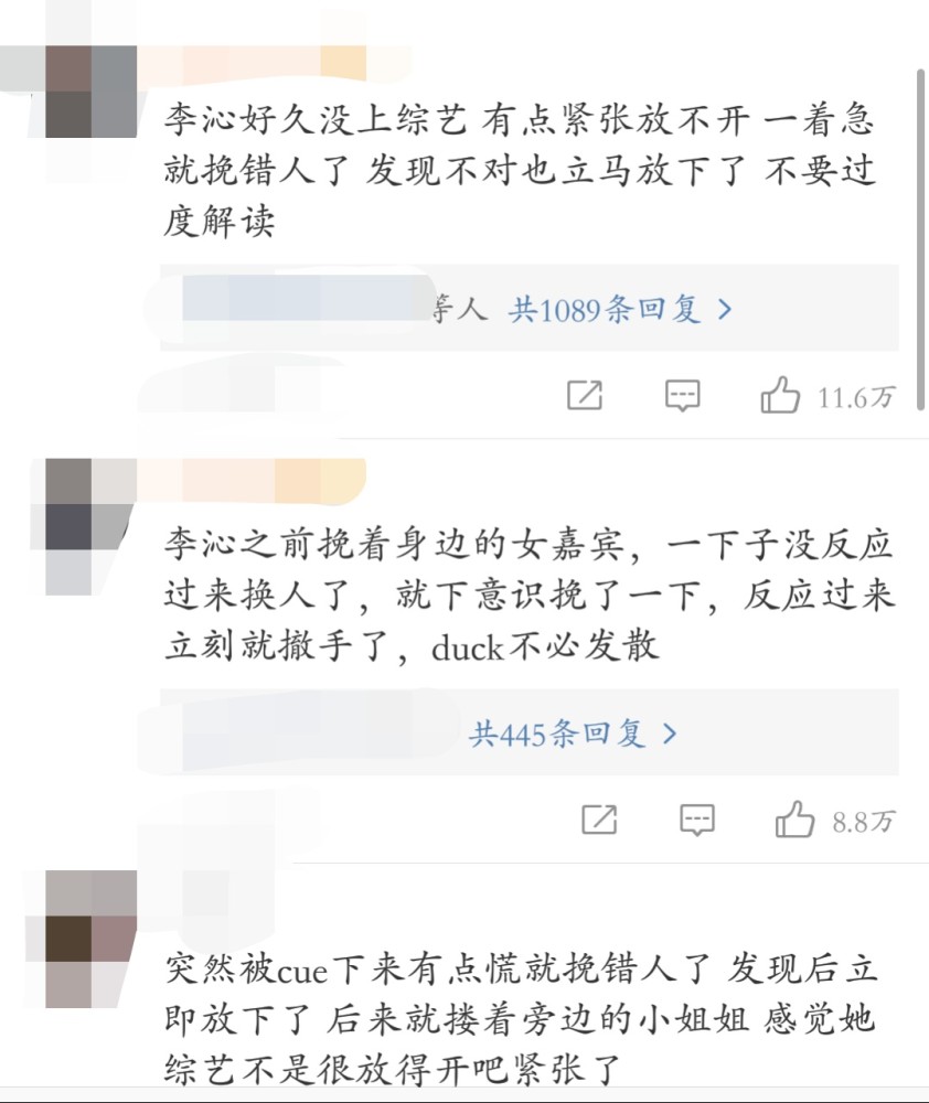 李沁本人确实已经两年没有参加过综艺了,紧张的情况确实存在,而且李沁之前挽着宋轶的胳膊,身边换人之后没有太在意,下意识地挽上了张若昀,发现挽错了之后立刻放下了手。