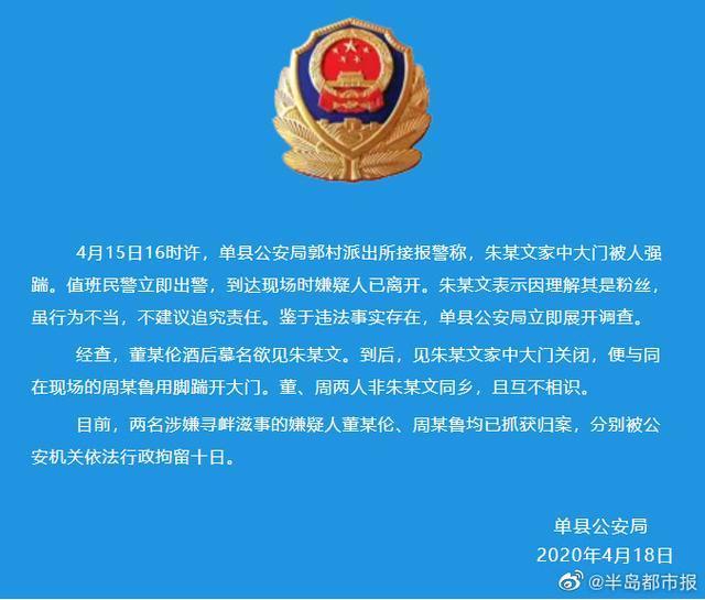 一名微博认证为农民歌手朱之文的人,4月18日发微博称:说一下今天出门了,在临沂一个村的人喝了酒喊门睡觉了,没听见就踹门了,都是老朱家的人,都是乡里乡亲的,低头不见抬头见,不要跟他们一般见识,但是随后朱之文在警方的调查中说,自己并不认识这两个人,也不是同村的,由此可见该账号的真实性存疑。