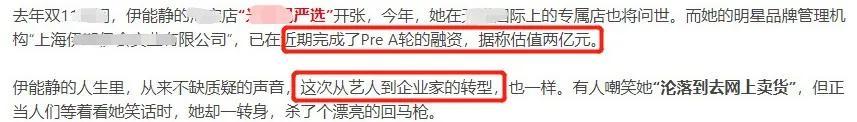 2018年伊能静打着自己女儿名号开始创业,2019年完成了A轮融资,据传估值两个亿,打出了从艺人到企业家转型的口号,喊话要杀个漂亮的回马枪。