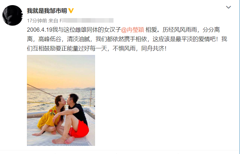 晒照之时,邹市明不忘发文告白妻子冉莹颖,原来今天(4月19日)是小两口相爱14周年纪念日,文中邹市明称妻子冉莹颖为“雌雄同体的女汉子”这样一番话语笑翻众人,随后邹市明表露虽然两人先前经历风风雨雨,分分离离,但现在依旧携手相依保持恩爱。话语之中表露对妻子冉莹颖的宠爱。
