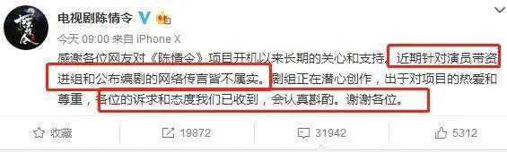 在遭到了原著粉的抵制后《陈情令》官博很快就发了一条声明,大致意思是:谢谢大家的支持和关心,关于演员带资进组和公布编剧的传言都是不真实的,大家的诉求都收到了,会认真斟酌,谢谢支持!