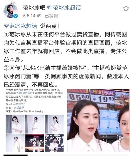 不过范冰冰粉丝们很快发声,划重点:发声者为范冰冰吧,而非范冰冰本人和工作室。在文案中,其声明范冰冰从未在任何平台中做过卖货直播,且网传的"范冰冰巴结主播薇娅被拒"被薇娅本人澄清。