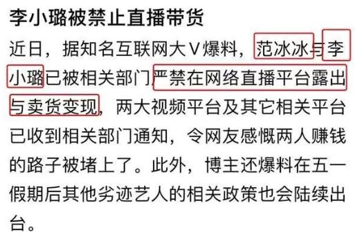 近日,根据某互联网大V爆料,严禁劣迹艺人直播带货,其中范冰冰和李小璐被点名。此外,禁止俩人直播的通知由相关部门告知各大平台。